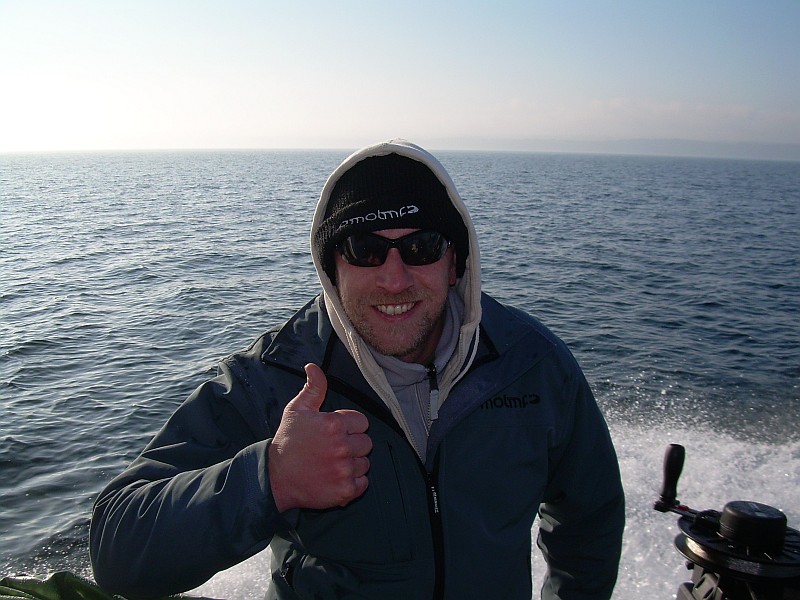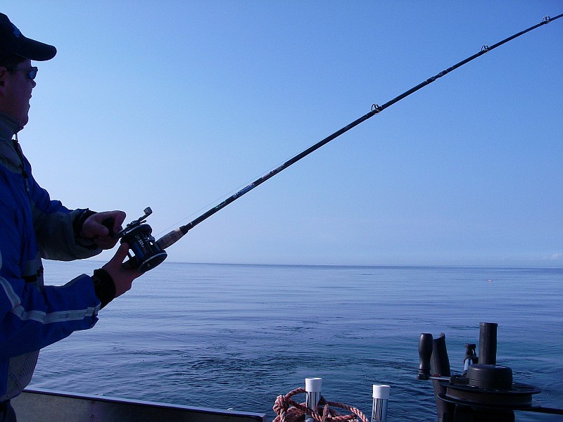 Plötzlich klingelte das Telefon Tripple Hook auf dem anderen Boot - alle Fische bekommen. Hhmmm - das ja nen Ding. Wir drehten so unsere Runden und es ging nichts mehr. Telefonanruf - Biss gehabt - nicht hängen geblieben. Bei uns ging noch immer nichts. Und so butterten wir durch den Tag, der Wind schlief ein, die Temperaturen knickten ein, der Wind ging gegen null und die Motivation ebenso. Und ein weiterer Anruf Double Hook - hier hat jeder seinen Lachs - wir machen dann mal Feierabend. Das war gegen 15:00 Uhr. Unser Guide gab aber nicht auf und wollte durchziehen, bis auch bei uns jeder seinen Lachs hat. Da hatte jemanden richtig der Ehrgeiz gepackt. So verging die Zeit und irgendwie verging mir persönlich langsam die Lust und mein Gesicht wurde immer Länger, die Temperaturen sanken und die Sonne ging langsam gen Horizont.