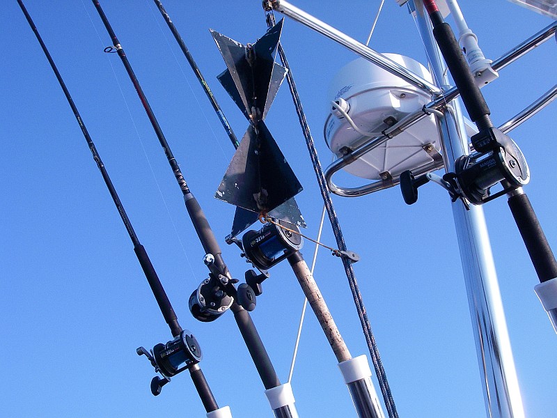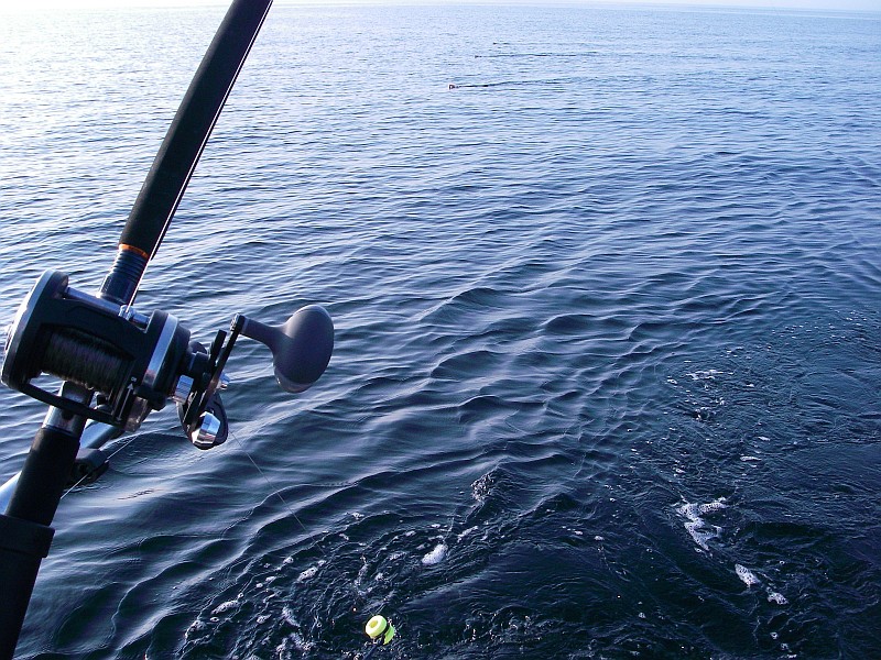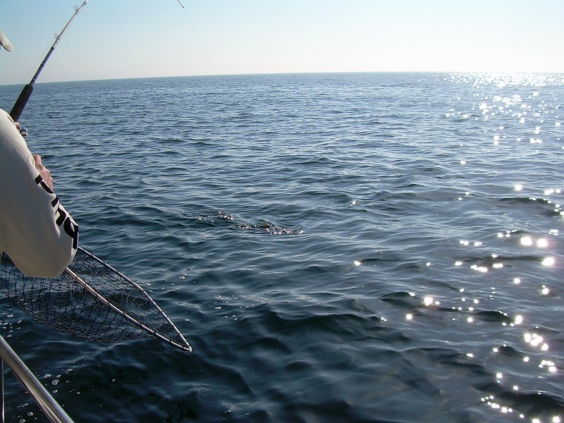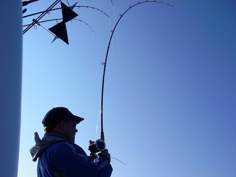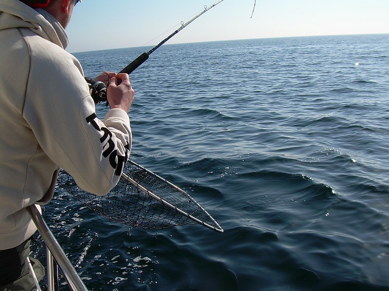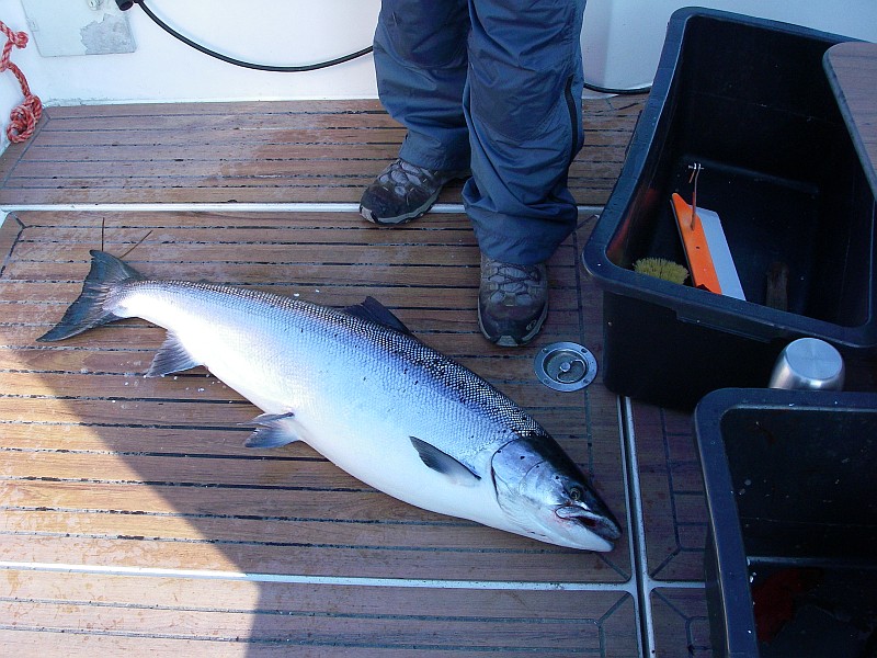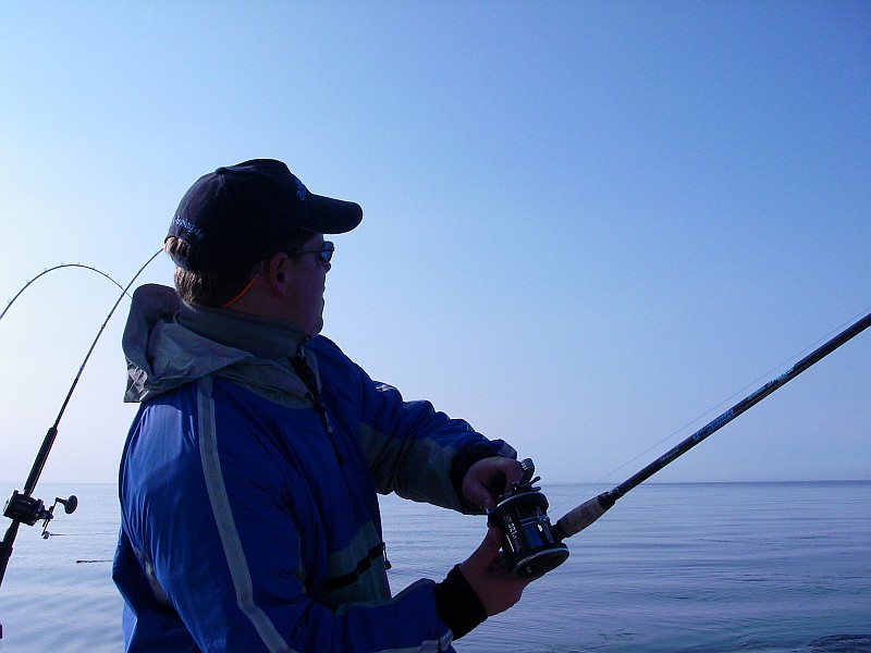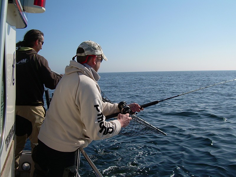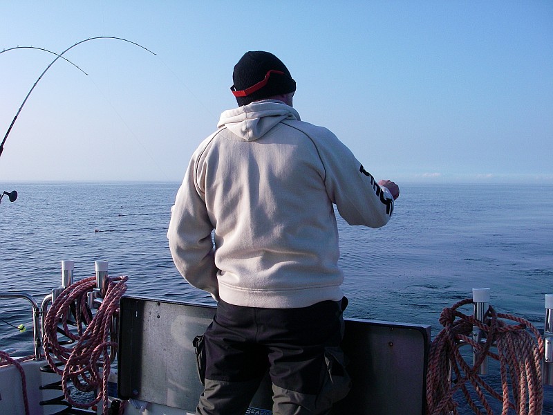 Nach einer halben Stunde Fahrt dann das bekannte Szenario. Minimalgas, zwei Treibanker raus, um den Kahn etwas zu bremsen und nach und nach die Ruten raus. Planner hier, Downrigger dort, ein Flasher hier, nen Appex dort ..... und so zogen wir unsere Bahnen und der Volvo Penta V6 gurgelte brav vor sich hin. Es war 10:00 da machte sich plötzlich eine der Ruten, die am Downrigger eingehängt, waren gerade. Unser Bootsführer an die Rute, krum gemacht, Popeye in die Hand gedrückt und los ging der erste Drill. Was schief gehen konnte, ging dann auch schief. Hatte sich Herr Lachs doch in einer der 9 anderen Ruten verheddert. Also drillten wir zu zweit. Nachdem wir das entwirrt haben ging der Fisch unterm Downrigger durch. Das machte die Sache natürlich nicht einfacher. Nach ein paar Minuten und einem gekonnten Keschermanöver lagen die geschätzt über 10Kg dann an Deck und der Freudenschrei war sicherlich von Dänemark bis Polen zu hören.