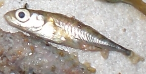 Ein wenige Wochen alter Stichling aus dem Magen einer Meerforelle. Der Stichling ist gerade einmal 2,5 Zentimeter lang und wurde sehr ufernah über einer Seegraswiese im Januar erbeutet.